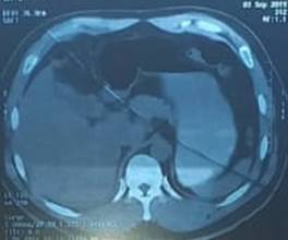 Presentamos el caso de un paciente masculino de 45 años de edad con antecedentes personales de obesidad gradi I, hipertensión arterial en tratamiento con enalapril 10mg y atenolol 25mg al día, dos años de dolor abdominal en hipocondrio derecho sin estudio y cirugía previa por hemorroides. Acude al servicio de emergencia por presentar hace 24 horas, dolor agudo tipo cólico de moderada a severa intensidad en hipocondrio derecho que se irradia a región lumbar, murphy positivo, y ausencia de signos de irritación peritoneal. El hemograma mostró leucocitos 8.400, neutrófilos 54.3%, úrea: 37,9 creatinina: 1,45, TGO: 42,9 TGP: 57,9 fosfatasa alcalina total: 6,32. La ecografía de ingreso reportó vesícula de paredes engrosadas de 4 mm irregulares de tamaño normal de 47 cc de volumen con cálculos en su interior, el mayor de 15 mm más barro biliar en moderada cantidad, y masa sugestiva de cáncer biliar. (ver figura 1) Se decide el ingreso a hospitalización y se extiende el estudio con tomografía simple trifásica en la cual se observa vesícula bien contraída impresionando en gorro frigio de paredes engrosadas de contenido no valorable por este método. (ver figura 2) Se realizan marcadores tumorales obteniéndose CA19-9: 0,60 Y Alfafetoproteina: 1,86 dentro de parámetros normales. Se decide realizar colecistectomía laparoscópica la cual se desarrolla con tiempo quirúrgico prolongado debido a la obesidad del paciente. Como hallazgo postquirúrgico se encontró vesícula escleroatrófica de 5x3x3 cm de paredes gruesas calcificadas con un lito en su interior, presencia de vasos de neo formación adherida a planos profundos intrahepáticos, con múltiples adherencias hacia epiplón, intestino delgado y colon cístico aumentado de tamaño, colédoco macroscópicamente normal.